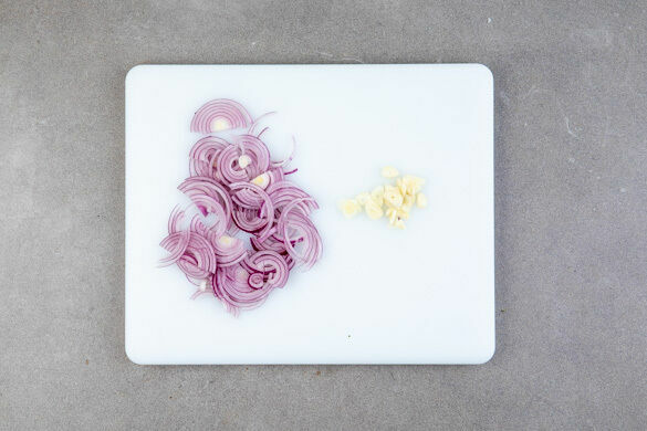 In einem großen Topf ausreichend gesalzenes Wasser für die Pasta zum Kochen bringen. Die Zwiebel schälen, halbieren und in feine Streifen schneiden. Den Knoblauch schälen und in feine Scheibchen schneiden.