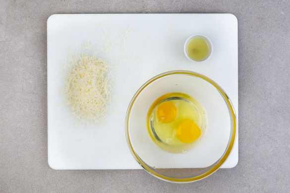 Den Käse fein reiben. Die Zitrone halbieren und auspressen. Die Eier in einer kleinen Schüssel mit einer Gabel verquirlen. Die Pinienkerne in einer großen Pfanne ohne Zugabe von Fett rösten, bis sie schön duften und leicht gebräunt sind. Zum Abkühlen aus der Pfanne nehmen, die Pfanne aufbewahren.