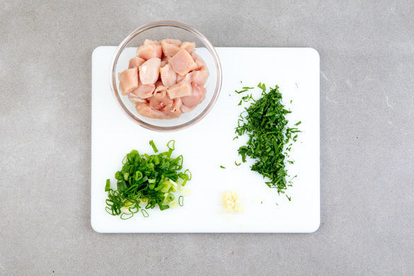 In einem großen Topf ausreichend gesalzenes Wasser für die Pasta zum Kochen bringen. Das Fleisch mit etwas Küchenkrepp trocken tupfen und in ca. 1cm große Würfel schneiden. Die Petersilie samt Stängeln fein hacken. Die Lauchzwiebeln in feine Ringe schneiden. Den Knoblauch schälen und fein hacken.