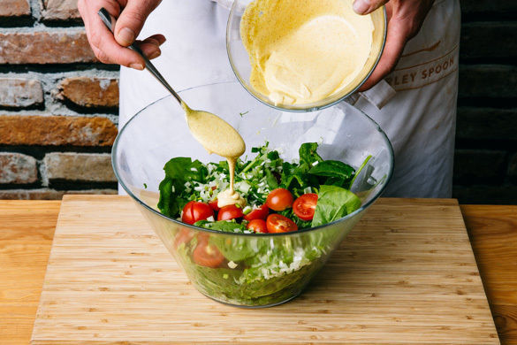 Zarter Babyspinat eignet sich ganz hervorragend für die Verwendung in den leckersten Salaten. Hier bringen wir ihn einer feinen Kombination mit cremig-köstlicher Avocado, saftigem Hähnchenbrustfilet, knackigen Kirschtomaten und gerösteten Kürbiskernen. Das lecker-leichte Joghurtdressing wird mit aromatischem Currypulver verfeinert. Guten Appetit!
