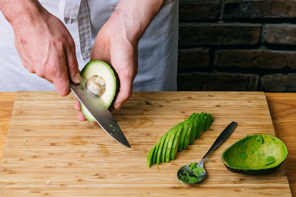 Die Avocado um den Kern herum halbieren und die Hälften auseinanderdrehen. Die Hälfte mit dem Kern in der hohlen Hand halten und die Schneide eines großen Messers vorsichtig in den Kern schlagen. So kann der Kern einfach herausgedreht werden. Das Avocadofruchtfleisch mit einem großen Löffel aus den Schalen heben und in dünne Scheiben schneiden.
