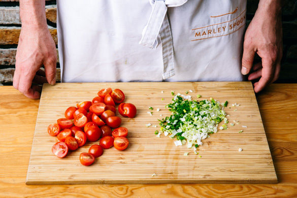 Die Kirschtomaten halbieren. Die Lauchzwiebel fein hacken.