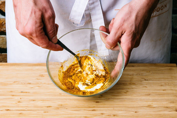 Den Joghurt mit 1EL Olivenöl, 1EL (hellem) Essig, der 1/2 des Currypulvers sowie Salz und Pfeffer verrühren. Tipp: Wer mag, kann auch mehr Currypulver verwenden.