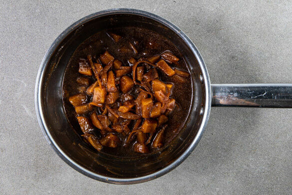 Die Birnen, die Orangenschale, den Orangensaft, 150g Zucker, das Spekulatiusgewürz und 150ml Wasser in einem kleinen Topf vermengen, bis sich der Zucker auflöst. Bei starker Hitze aufkochen und anschließend bei mittlerer Hitze 10–15Min. einköcheln lassen, bis das Kompott eine karamellartige Konsistenz hat. Gelegentlich umrühren.