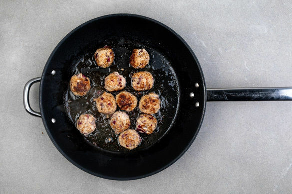 Die Hackbällchen in einer mittelgroßen Pfanne mit 1EL Olivenöl bei mittlerer Hitze ca. 5Min. rundum anbraten, bis das Fleisch durch ist.
