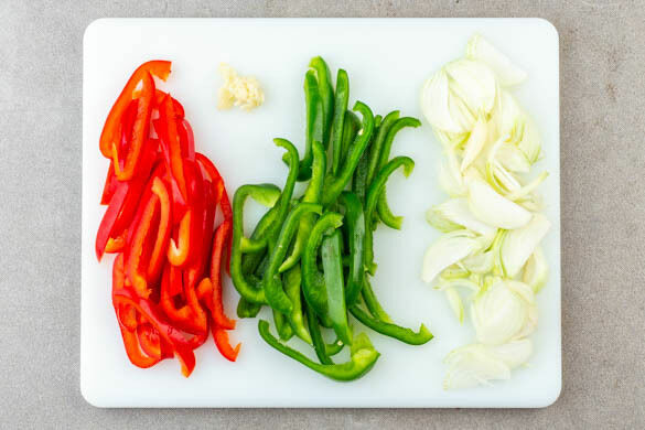 Die Paprika vierteln, entkernen und in dünne Streifen schneiden. Die Zwiebel schälen, halbieren und in feine Streifen schneiden. Den Knoblauch schälen und sehr fein würfeln oder durch eine Knoblauchpresse drücken.