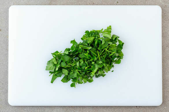 Inzwischen die Petersilie samt Stängeln grob hacken.