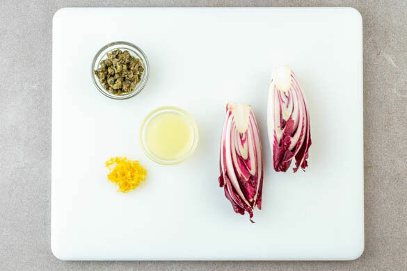 Inzwischen den Backofen auf 60°C vorheizen. Den Chicorée längs halbieren. Die Zitronenschale abreiben, dann die Zitrone halbieren und auspressen. Die Kapern grob hacken. Das Brühgewürz in 600ml heißem Wasser auflösen. Die Aubergine ohne Deckel weitergaren, bis das Wasser verdampft ist und die Aubergine braun wird, dann auf niedrigster Stufe warm halten.