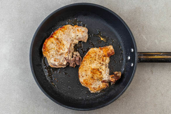 Das Fleisch aus der Pfanne nehmen und auf einem mit Backpapier ausgelegten Backblech im Ofen warm halten. Die Schnittflächen des Chicorées mit je 1 Prise Salz und Zucker an einreiben, dann den Chicorée mit den Schnittflächen nach unten in die Pfanne geben und bei mittlerer Hitze 3–5Min. braten, bis die Schnittflächen goldbraun und karamellisiert sind.