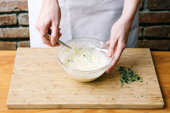 Die Baconscheiben in feine Streifen schneiden und unter die Käse-Ei-Creme mischen.