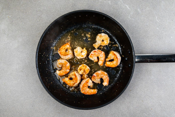 Die Garnelen und den Knoblauch in einer mittelgroßen Pfanne mit 2EL Olivenöl bei starker Hitze 1–2Min. scharf anbraten. Die Pfanne vom Herd nehmen und die Garnelen etwas nachziehen lassen. Mit Salz und Pfeffer würzen.