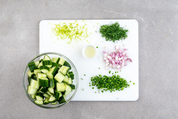 Die Gurken längs vierteln und in ca. 1cm große Würfel schneiden. Die Schalotte schälen und grob würfeln. Die Limettenschale abreiben, dann die Limetten halbieren und auspressen. Die Dillspitzen abzupfen und fein schneiden. Die Dillstängel separat klein schneiden, damit sie sich besser pürieren lassen. Den Schnittlauch in feine Röllchen schneiden.