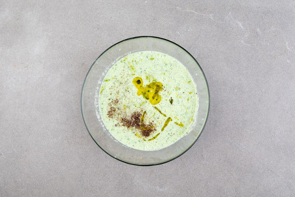 Die Gurken, die Schalotten, die Dillstängel und den Joghurt mit einem Stabmixer in einem hohen Gefäß fein pürieren, ggf. in zwei Durchgängen arbeiten. Mit viel Salz und Pfeffer kräftig würzen, dann mit 1–2EL Olivenöl, etwas Limettensaft sowie Limettenschale abschmecken.