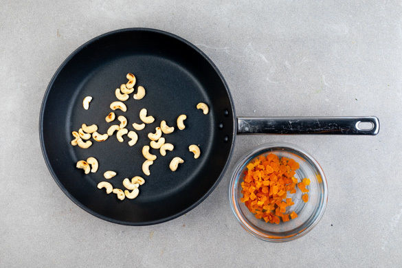 In der Zwischenzeit die getrockneten Aprikosen fein hacken. Die Cashews in einer kleinen Pfanne bei niedriger Hitze ohne Zugabe von Fett 1–2Min. anrösten, bis sie anfangen zu duften. Vorsicht, die Cashews können schnell anbrennen!