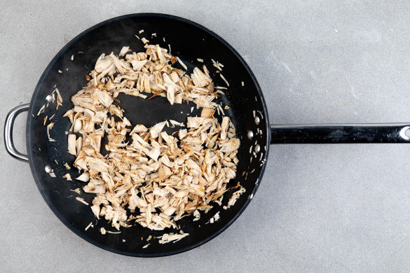 Die Jackfrucht in ein Sieb abgießen. Anschließend jedes Stück erst mit einer breiten Messerklinge flach drücken und dann in feine Streifen schneiden.