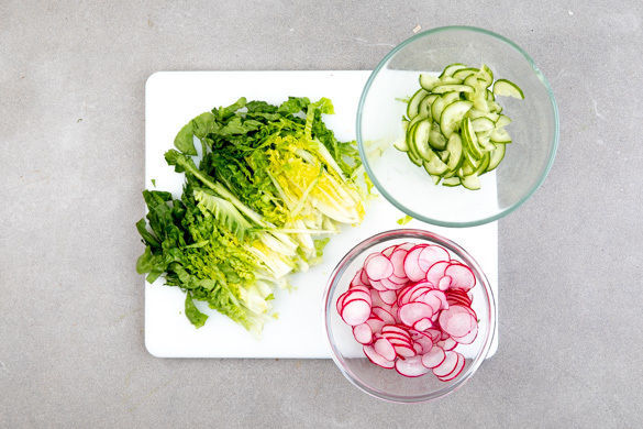 Die Radieschen putzen und in feine Scheiben schneiden. Die Gurke längs halbieren und schräg in dünne Scheiben schneiden. Den Salat entweder längs achteln oder ebenfalls in feine Streifen schneiden. Die Radieschen, die Gurken, den Salat und den grünen Teil der Lauchzwiebeln mit 1–2EL Essig und 1 Prise Salz vermengen.