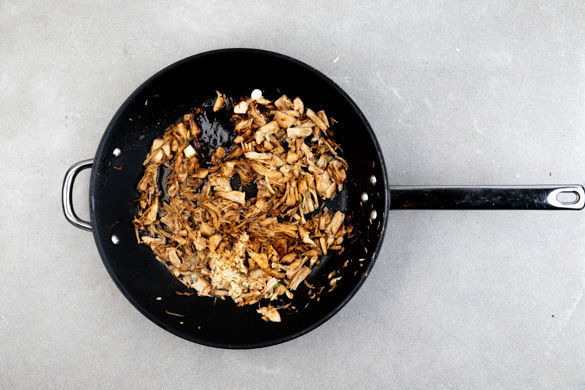 Den weißen Teil der Lauchzwiebeln und den Ingwer zu den Jackfruchtstreifen in die Pfanne geben, die Hitze reduzieren und die Gewürzmischung sowie die Hoisinsauce unterrühren. 150–200ml Wasser zugeben und die Sauce mit Salz und Zucker abschmecken.