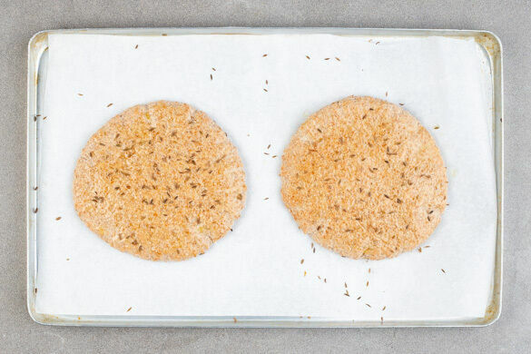 2 Pitabrote mit 2TL Olivenöl bepinseln, dann mit dem restlichen Kreuzkümmel und 1 Prise Salz bestreuen. Die Pitabrote auf einem mit Backpapier ausgelegten Backblech im mittleren Teil des Ofens ca. 8Min. backen. Tipp: Die übrigen Pitas einfrieren und für ein anderes Rezept verwenden.