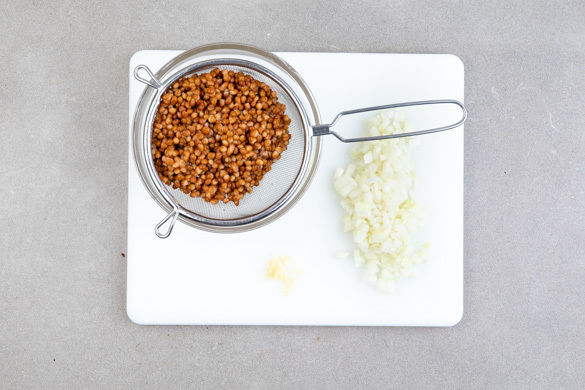 Den Backofen auf 200°C Umluft (220°C Ober-/Unterhitze) vorheizen. Die Zwiebel schälen, halbieren und fein würfeln. Den Knoblauch schälen und sehr fein hacken oder durch eine Knoblauchpresse drücken. Die Linsen in ein Sieb abgießen und abtropfen lassen.