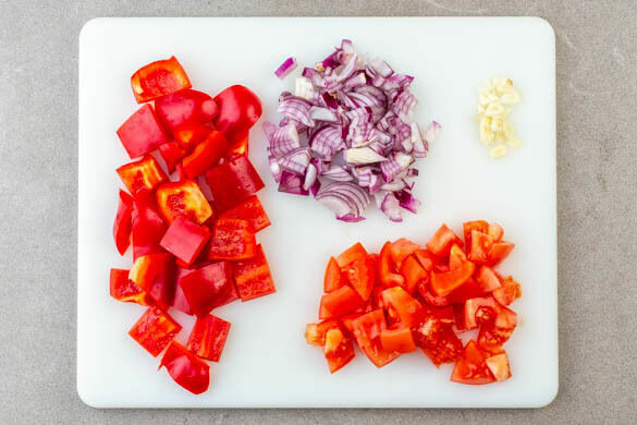 In einem kleinen Topf 300ml leicht gesalzenes Wasser für den Reis zum Kochen bringen. Die Paprika halbieren, entkernen und in grobe Würfel schneiden. Die Zwiebel schälen, halbieren und grob würfeln. Den Knoblauch schälen und in feine Scheibchen schneiden. Die Tomaten grob würfeln.
