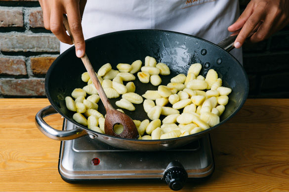 Die Gnocchi in einer großen Pfanne mit 1–2EL Olivenöl bei starker Hitze 2–3Min. anbraten.