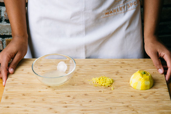 Ca. die 1/2 der Zitronenschale abreiben, dann die Zitrone halbieren und eine Hälfte auspressen, die andere Hälfte in Spalten schneiden.