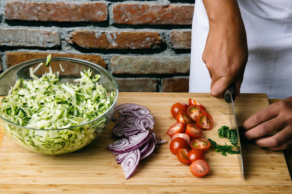 Die Zucchini mit einer Küchenreibe grob raspeln und mit 1TL Salz vermischt ca. 5Min. ziehen lassen. Inzwischen die Kirschtomaten halbieren. Die Zwiebel schälen, halbieren und in feine Streifen schneiden. Den Knoblauch schälen und fein hacken. Die Basilikumblätter von den Stängeln zupfen und in feine Streifen schneiden.