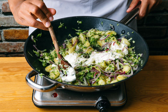 Die Zucchiniraspel in einem Sieb oder Geschirrtuch gut auswringen, mit den Zwiebeln und dem Knoblauch zu den Gnocchi geben und 3–4Min. mitbraten.