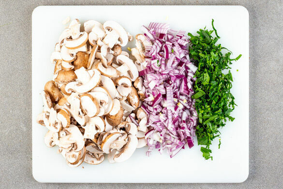 In einem mittelgroßen Topf ausreichend gesalzenes Wasser für die Pasta zum Kochen bringen. Die Champignons ggf. säubern und in dünne Scheiben schneiden. Die Zwiebel schälen, halbieren und fein würfeln. Die Petersilie samt Stängeln fein hacken.
