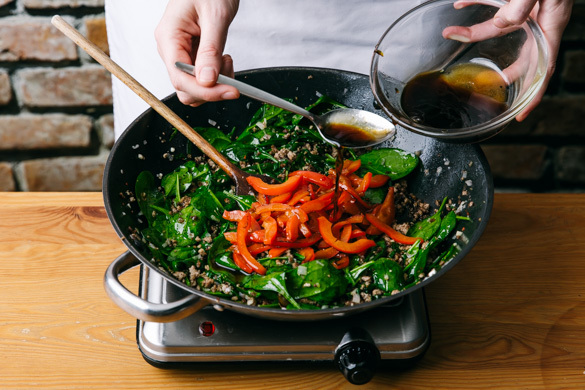Die Zwiebeln zum Hackfleisch in die Pfanne geben und ca. 1Min. mitbraten. Den Knoblauch, die Chilischote nach Geschmack und das geschnittene Basilikum unterrühren, dann nach und nach den Spinat unterheben, bis dieser zusammengefallen ist. Die Paprikastreifen und die Würzsauce zugeben und alles einmal aufkochen lassen.