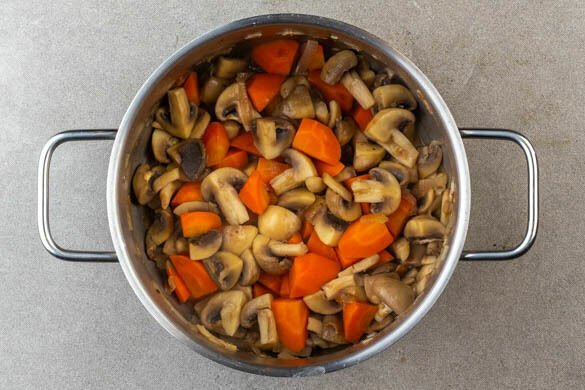 Inzwischen die Pilze vierteln, in den Topf geben und unter gelegentlichem Rühren 5–7Min. mitbraten, bis das Gemüse weich ist. Die Bohnen in einem Sieb mit kaltem Wasser abspülen und abtropfen lassen.