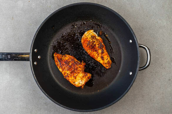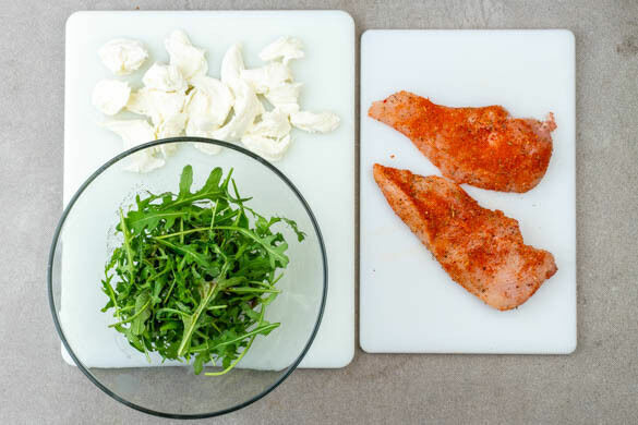 2EL Olivenöl, 1EL Balsamicoessig und je 1 kräftige Prise Salz und Pfeffer zu einer Vinaigrette verrühren, dann mit dem Rucola vermengen und beiseitestellen. Den Mozzarella mit den Händen in mundgerechte Stücke zupfen. Das Fleisch trocken tupfen, horizontal halbieren und rundum mit der Gewürzmischung und je ½TL Salz und Pfeffer würzen.