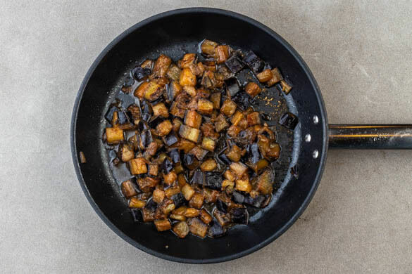 Die Aubergine in ca. 0,5cm kleine Würfel schneiden und in einer mittelgroßen Pfanne mit 2EL Olivenöl bei mittlerer Hitze 1–2Min. anbraten. Mit je 1 kräftigen Prise Salz und Pfeffer würzen und ausreichend Wasser zugeben, sodass der Boden der Pfanne bedeckt ist. Einen Deckel auflegen und die Auberginen in 5–8Min. weich garen.