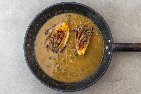 1EL Butter und die Kapern zum Chicorée in die Pfanne geben und 30–60Sek. mitbraten. Den Chicorée vorsichtig wenden, ½EL Mehl hinzugeben und unter ständigem Rühren 30–60Sek. mitbraten. Die ½ der Brühe langsam einrühren und zum Kochen bringen, dann bei niedrigster Hitze 2–3Min. köcheln lassen, bis eine sämige Sauce entsteht.