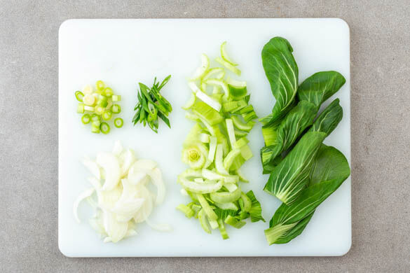 Die Zwiebel schälen, halbieren und in feine Streifen schneiden. Den weißen Teil der Lauchzwiebel in ca. 0,5cm große Stücke, den grünen Teil in feine Ringe schneiden. Die grünen Pak-Choi-Blätter ganz lassen, den weißen Teil in ca. 1cm breite Streifen schneiden.