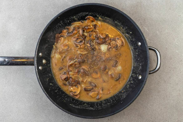Das Brühgewürz in 500ml heißem Wasser auflösen. 2EL Mehl über die Pilze und die Zwiebeln streuen und unter ständigem Rühren 1–2Min. mitbraten, dann nach und nach und unter ständigem Rühren die Brühe angießen.