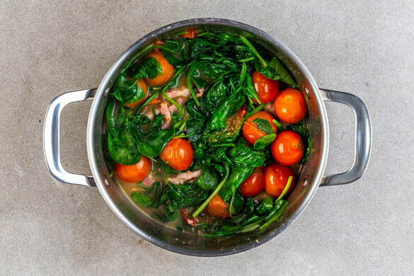 Den Spinat und 50ml Wasser zum Bacon und den Tomaten in den Topf geben und alles abgedeckt bei mittlerer Hitze 3–4Min. köcheln lassen, bis die Tomaten weich werden und der Spinat zusammengefallen ist. Ggf. die Tomaten mit einer Gabel zerdrücken, damit der Saft austritt.