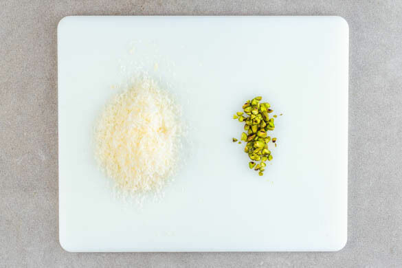 Den Käse fein reiben. Die Pistazien grob hacken.