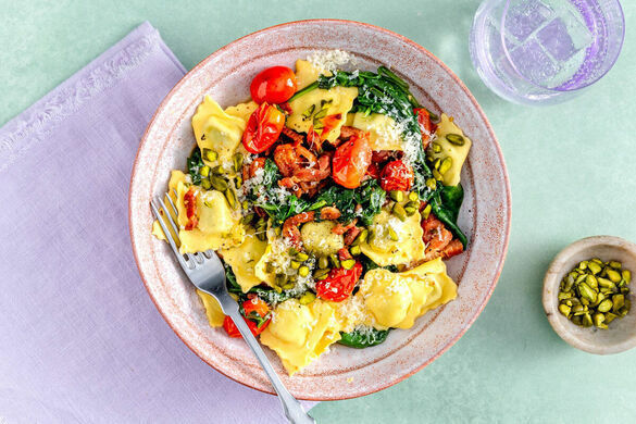Superfix und superlecker soll es sein? Dann haben wir heute genau das Richtige für dich: Feinste Ricotta-Spinat-Tortelli erobern zusammen mit rauchigem Bacon, fruchtigen Kirschtomaten und würzigem Salbei deinen Teller. Der fixe Festschmaus wird ganz elegant mit geriebenem Käse und knackigen Pistazien verfeinert. Einfach herrlich – wir sind uns sicher, deine Geschmacksknospen werden vor Freude Luftsprünge machen! Guten Appetit!