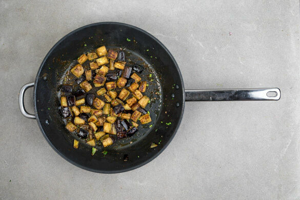 Die Auberginen in ca. 1cm große Würfel schneiden. Die Petersilienblätter abzupfen und grob, die Stängel fein hacken.