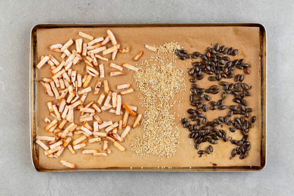 Das Fleisch trocken tupfen und mit dem Sesam und den Kürbiskernen auf einem zweiten mit Backpapier ausgelegten Backblech verteilen. Mit 2TL Pflanzenöl sowie je 1 kräftigen Prise Salz und Pfeffer vermengen und ca. 10Min. im Ofen backen, bis das Fleisch gar ist.