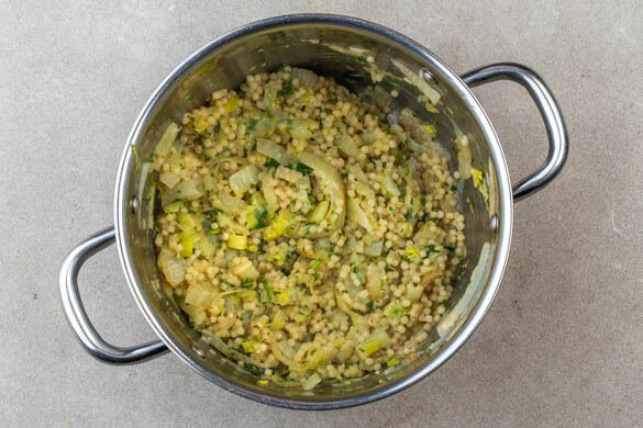 Den Perlencouscous ca. 1Min. mitbraten, dann 400ml heißes Wasser aus dem Wasserkocher und die ½ des Brühgewürzes unterrühren. Den Perlencouscous abgedeckt bei niedriger bis mittlerer Hitze 15–20Min. unter gelegentlichem Rühren köcheln lassen, dabei nach Bedarf etwas mehr Wasser hinzufügen. Wenn der Perlencouscous gar ist, die restliche Flüssigkeit ohne Deckel verdampfen lassen.