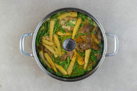 Die Enden der grünen Bohnen entfernen. Das Fleisch trocken tupfen und in einem großen Topf mit 2EL Pflanzenöl bei mittlerer bis starker Hitze ca. 30Sek. anbraten. Dann den Reis, die Bohnen und den Babymais zugeben und ca. 1Min. weiterbraten.