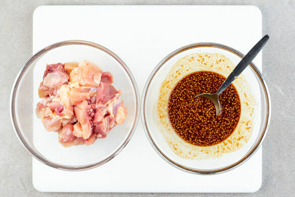 Die ½ der Sojasauce mit 1½TL Stärke verrühren, bis keine Klümpchen mehr zu sehen sind. Dann die Hoisinsauce, 1EL hellen Essig, den Sesam, ½TL Zucker und 1 Prise Salz unterrühren. Das Fleisch trocken tupfen und in ca. 2cm große Stücke schneiden.