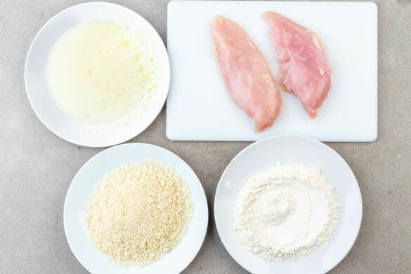 Auf einem tiefen Teller 4EL Weizenmehl bereitstellen. Auf einem zweiten Teller 3TL Senf mit 50ml Milch verrühren. Das Paniermehl auf einen dritten Teller geben. Das Fleisch trocken tupfen und von beiden Seiten mit 1 kräftigen Prise Salz würzen.