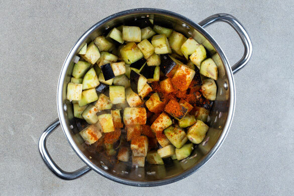 Die Auberginen und die Schalotten in einem mittelgroßen Topf mit 1EL Olivenöl und 1 kräftigen Prise Salz bei mittlerer bis starker Hitze 4–5Min. anbräunen. ⅔ der Harissapaste einrühren und ca. 1Min. mitbraten.