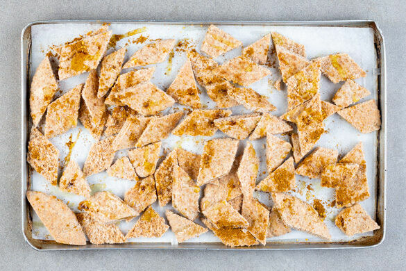 Die Pitabrotstücke mit der ½ der Nordafrikanischen Gewürzmischung, 2EL Olivenöl und 1 kräftigen Prise Salz vermengen, auf einem mit Backpapier ausgelegten Backblech verteilen und im Ofen in 10–11Min. knusprig und goldbraun backen. Die Croûtons nach der Hälfte der Backzeit wenden.