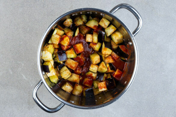 Die Auberginen mit den passierten Tomaten und 100ml Wasser ablöschen und bei mittlerer Hitze 10–12Min. köcheln, bis die Sauce eingedickt und das Gemüse weich ist. Das Auberginenragout mit Salz, Pfeffer und der restlichen Harissapaste abschmecken.