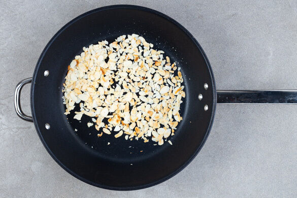 Die Mandelblättchen in einer kleinen Pfanne ohne Zugabe von Fett bei mittlerer Hitze 1–2Min. goldbraun anrösten. Vorsicht, sie können schnell zu dunkel werden. Zum Abkühlen aus der Pfanne nehmen, die Pfanne aufbewahren. In einem mittelgroßen Topf ausreichend gesalzenes Wasser für die Pasta zum Kochen bringen. Den Knoblauch schälen und halbieren.