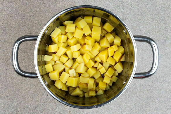 Den Backofen mit Grillfunktion oder Ober-/Unterhitze auf 200°C vorheizen. In einem mittelgroßen Topf ausreichend gesalzenes Wasser für die Kartoffeln zum Kochen bringen. Die Kartoffeln schälen, in ca. 1cm große Stücke schneiden, dann in das kochende Wasser geben und in 15–20Min. gar kochen. Tipp: Die Kartoffeln sind durch, wenn sie sich bei der Messerprobe leicht vom Messer lösen.
